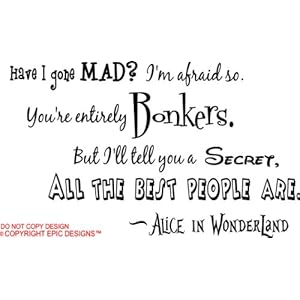 Alice in Wonderland Have I gone Mad? I'm afraid so. You're entirely Bonkers. But I'll tell you a secret, all the best people are. cute Wall art Wall sayings quote
